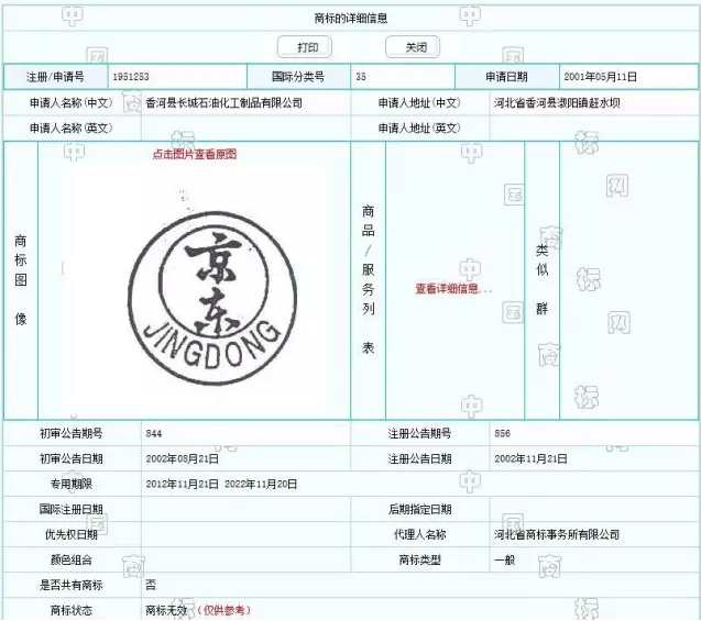 时间就这么一天天过去,直到后来,有了京东商城出现。作为一家电商平台,其品牌核心就是“推销(替他人)”。顺理成章的,京东公司也想注册第35类3503群组“推销(替他人)”的“京东”商标。但是,注册申请被无情的驳回。(详情见钛媒体文章:刘强东心头的刺:“京东”推销类商标权已旁落他人?)